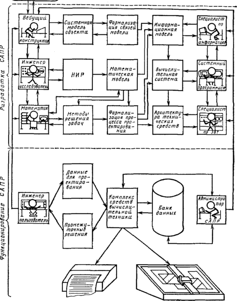 Как видно из рассмотрения представленной на рис. 1 схемы, разработка процесса автоматизированного проектирования требует тесного сотрудничества ученых и инженеров разных специальностей — конструкторов, математиков, специалистов по автоматизированной обработке информации, программистов, электронщиков и организаторов производства (рис. 2).