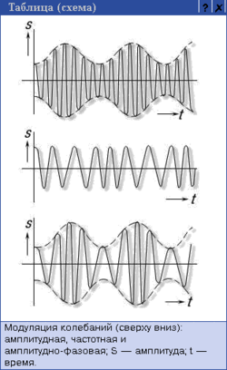 |   Рисунок 3. Модуляция колебаний (сверху вниз): амплитудная, частотная и амплитудно-фазовая; S – амплитуда, t – время.  |