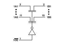Видно, что шина данных коммутируется полевым транзистором с изолированным затвором, на который подается управляющее напряжение со входа управления. Элемент полностью симметричен по входу и выходу данных, что делает его применение весьма удобным.