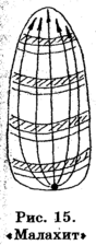 13. «Малахит». Самый сложный и один из самых красивых рисунков (в результате получается эффект змеиной кожи). Все лаки этой композиции должны быть различных оттенков, но в одной цветовой гамме. На основу нанесите несколько горизонтальных дугообразных полосок. Иголочкой проведите несколько линий из одной точки снизу вверх (рис. 15).