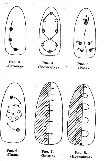 1. «Веточка». Нанесите на ноготь лак, к примеру, белого цвета. Пока он не застыл, капните на него несколько маленьких зеленых капель. Пока лак не просох, осторожно проведите иголочкой по капелькам, как бы "вытягивая" веточки (рис. 3). Здесь и в дальнейшем стрелкой показано направление движения иголочки.