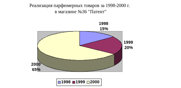 еализация парфюмерных товаров за 2000 год значительно выросло по сравнению с 1998г. Сведения о реализации парфюмерной продукции за период 1998-2000г. в процентах приведены на рис.14.
