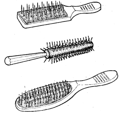 В процессе работы между зубьями расчесок и щетиной щеток скапливаются различные загрязнения в виде мелких частичек пыли, жира и др. Поэтому щетки необходимо систематически очищать водой и мылом.