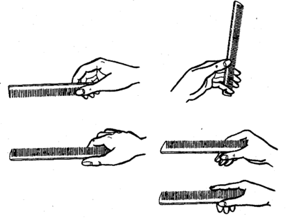 1. Расческу держат в правой руке обушком к ладони. Большой палец правой руки упирается в среднюю часть расчески внутренней стороны от мастера, а остальные пальцы поддерживают расческу с другой стороны. Основную роль при этом способе держания расчески играют большой, указательный и средний пальцы. Безымянный и мизинец помогают выполнять те или иные движения расческой.