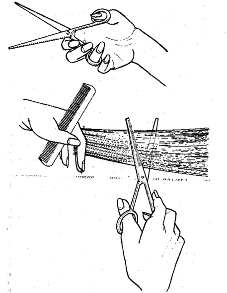 Во время стрижки волос ножницы держат в правой руке. При этом их разворачивают так, чтобы головка винта, скрепляющего две половинки ножниц, была обращена в сторону клиента.