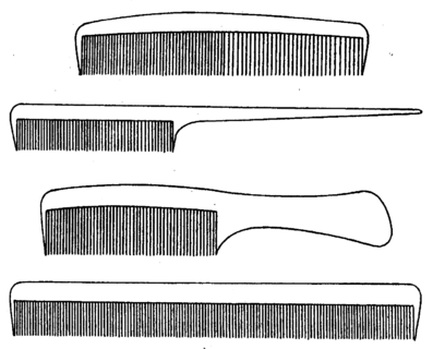 Комбинированные расчески предназначены для расчесывания, тупирования, начесывания и причесывания волос. Длина расчесок этого типа 15-20 см. Чем больше длина расчески, тем выше ее зубья м толще основание (обушок). Форма комбинированных расчесок конусообразная, причем в более узкой части конуса расположены частые зубья.