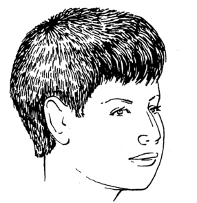 4. Волосы внизу затылка обработать, поднимая пряди и уменьшая длину волос к краевой линии роста. 5. Выделить прядь в середине теменной зоны, подняв вертикально, подстричь так, чтобы образовался плавный переход от коротких волос к длинной челке. 6. Последующие пряди фронтальной зоны, выделив радиальными проборами, обработать тем же приемом. 7. Выполнить окантовку, а затем и филировку прядей и челки. Фасоны стрижек «бобрик» и «каре» очень похожи, все они обычно бывают короткими и различаются лишь формой отдельных участков прически. При стрижке «бобрик» теменная часть прически имеет форму ровной площадки, остальные участки прически — такой же формы, как и в стрижке «ежик». Стрижка «каре» отличается от двух предыдущих тем, что имеет форму ровной площадки не только на теменной части прически, но и на височных участках. Выполнение этих фасонов стрижек имеет свою специфику, особенно оформление ровной площадки на теменном участке волос. Итак: 1. Предварительная обработка теменного участка: