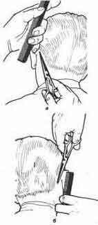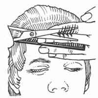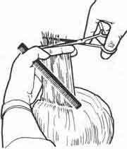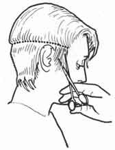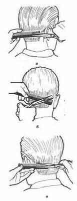 Ножницами. Возьмите в левую руку длинную расческу с частыми зубьями так, чтобы указательный палец был на зубьях, а большой придерживал расческу снизу. Введите расческу под волосы на шее, захватив ее зубьями так, чтобы указательный палец был на зубьях, а большой придерживал расческу снизу. Введите расческу под волосы на шее, захватив ее зубьями волосы на контурной линии затылка. Лишь после этого расческу слегка поворачивают к себе: ее плоскость должна находиться под острым углом к поверхности обрабатываемого участка волос. Чем короче стрижка, тем ближе нужно держать расческу к коже головы (т.е. тем меньше должен быть упомянутый угол).
