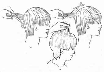 Перемещайте расческу вверх, против роста волос, и состригайте ножницами подхваченные расческой волосы. При этом полотна ножниц должны быть параллельны плоскости расчески. Ножницы и расческа перемещаются вверх одновременно (рис. 3).