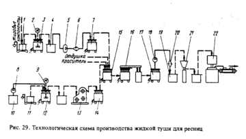 Декоративные средства для глаз. Тушь для ресниц. Для окраски, утолщения и удлинения ресниц и придания им четкой формы косметической промышленностью вырабатывается специальная тушь. Она состоит из основы и красок. В основу входят мыло, декстрин, парафин, воск, стеарин и отдушка. В качестве красок применяют сажу, марсы, ультрамарин и пр. Тушь выпускается в виде брусков в коробочках и з виде жидкой эмульсионной массы в небольших баллончиках различных тонов. Технология приготовления брусковой туши близка к технологии получения губных помад, эмульсионную тушь готовят аналогично тональным кремам. Технологическая схема производства жидкой туши для ресниц показана на рис. 29.