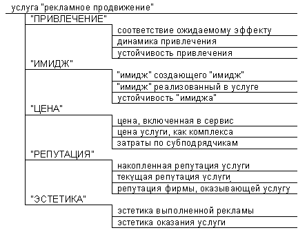В первую очередь, метод, построенный на базе маркетинговой инновационной модели "МКОТС", подразумевает определение составляющих услуги. Составляющие услуги - это потребности, удовлетворяемые с ее помощью. Очевидно, что любая услуга удовлетворяет не одну потребность, а несколько, например услуга по "рекламному продвижению товаров фирмы" удовлетворяет ряд потребностей руководителей предприятия, по отношению к которому такая услуга оказывается: привлечение клиентов; создание имиджа фирмы; соответствие цены предполагаемому ценовому диапазону; наличие "высокой" репутации фирмы, оказывающей услугу; эстетика (дизайн и эстетико-этические составляющие) оказываемой услуги.