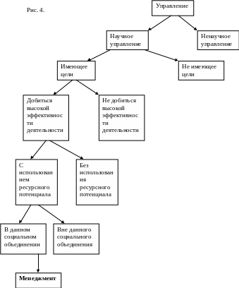 Содержание понятия менеджмент выведено с помощью логической операции определения через род и видовое отличие A=BC, где А- определяемое понятие (менеджмент), В- род (научное управление), С- видовое отличие (с целью достижения ее высокой эффективности, лучшего использования ресурсного потенциала данного социального объединения).