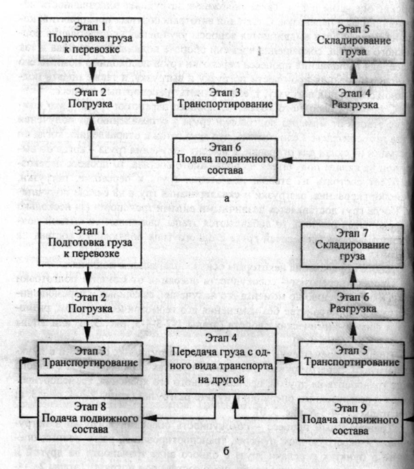 Процесс перемещения – совокупность погрузочных операций в пункте погрузки, перегрузочных операций в пунктах передачи груза с одного вида транспорта на другой, промежуточного его хранения, транспортирования и разгрузочных операций в пункте разгрузки (этапы 2-3-4 рис. 2 а; или этапы 2-3-4-5-6, рис. 2 б)