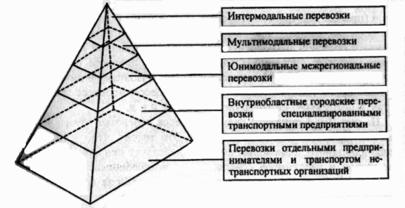 На рис.1 представлена иерархическая пирамида (структура) технологии и организации перевозок. В вершине этой пирамиды находятся интермодальные перевозки. Ниже – мультимодальные перевозки. Далее – юнимодальные перевозки, затем внутриобластные и городские перевозки специализированными автотранспортными предприятиями и, наконец, местные перевозки отдельных предпринимателей и собственным транспортом производственных и коммерческих структур.