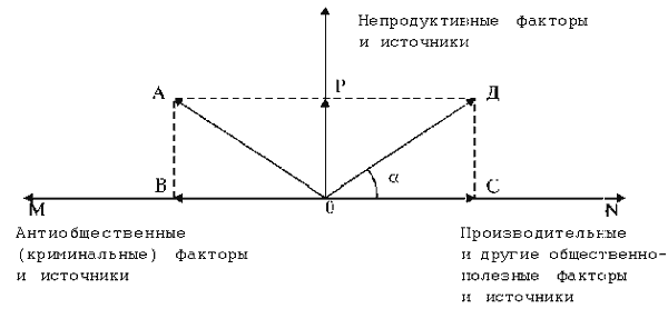 Отсутствие требуемой сопряженности в недостаточно развитой и поэтому деформированной и нестабильной экономике России переходного периода позволяет хозяйственным системам реализовать свои целевые функции (векторы ОА и ОД): получать прибыль, вытеснять конкурентов, расширить бизнес и т. д., не только и не столько за счет производительных (вектор ОС), сколько за счет непродуктивных, а подчас и антиобщественных факторов и источников (вектора ОР и ОВ).