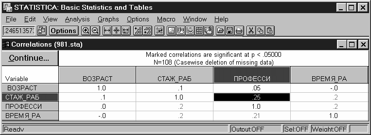 Рис. 3. Результат попарного вычисления коэффициента корреляции для результатов опроса, занесенных в исследовательский массив в программе STATISTICA 3
