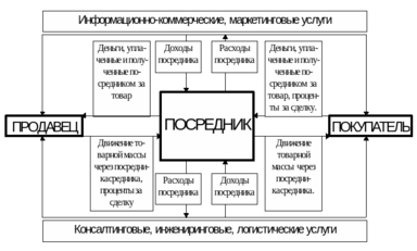 Основное же, специфическое отличие посредника от других участников товарного рынка проявляется в том, что посредник непосредственным образом не производит продукцию, не торгует напрямую, не дает деньги в кредит, но активно способствует осуществлению этих операций.