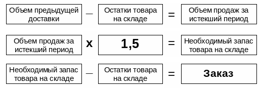 Применение данной методики направлено на формирование оптимального заказа с учетом циклической частоты доставки, в нашем случае стандартным циклом доставки является неделя, что в конечном итоге позволяет избегать перезатаривания торговой точки. За счет коэффициетна принимаемого в расчет возможно учитывать реально прогнозируемое повышение объема продаж (праздники) и увеличенный цикл посещеня (одна, две и более недели), например возможно применение следующих коэффициентов: