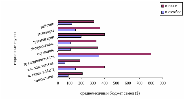 По данным Российского Независимого Института Социальных и Национальных Проблем (РНИСиНП) полученным в результате самооценки респондентов в июне 1998 г. среднемесячный бюджет российской семьи из трех человек составлял $295, а в октябре - $108, т.е. в 2.7 раза меньше. Маркетинговой службой ОАО «Краснодарская Сотовая Связь» было проведено подобное исследование среди абонентов и потенциальных покупателей. Результаты этого исследования хорошо видны на рис.5.