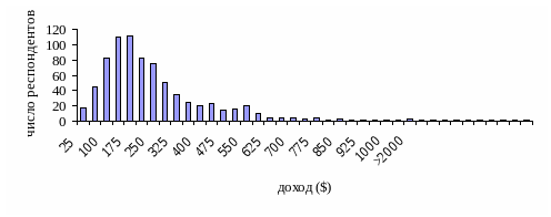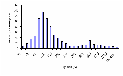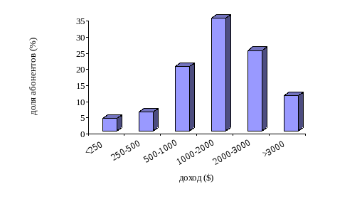 В России распределение доходов носит более сложный характер, чем в США. На рис.5 показана характерная для докризисной России структура доходов населения. Наличие двух пиков демонстрирует то, что в нашей стране совокупность неоднородна (существует расслоение общества и непропорциональное распределение доходов). Верхний пик распределения (в целом по России он составляет около 3-х миллионов человек) до сегодняшнего дня является основным источником абонентов сотовых сетей.