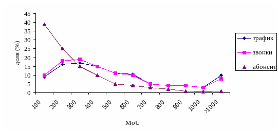 Рисунок 1 - Распределение численности абонентов, количества звонков и вклада в общий трафик в зависимости от MОU