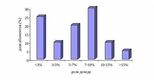 После снижения цен для корректировки оценки доходов нового слоя абонентов в периодических опросах используется вопрос, формулируемый как экспертная оценка: «Как Вы думаете, при каком уровне индивидуального месячного дохода большинство людей сможет позволить себе воспользоваться услугами сотовой связи (при условии сохранения нынешнего уровня цен)?». Полученные данные после понижающей корректировки дадут информацию о реальных средних доходах новых абонентов. Кроме доходов абонентов представляет интерес потребительская ценность сотовой связи в глазах новых абонентов. Для ее оценки используется вопрос: «Какую часть своих доходов (в процентах) Вы предполагаете тратить на услуги сотовой связи?». На рис 7 и 8 показаны результаты таких опросов.