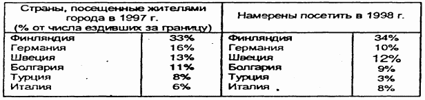 Например, какая-нибудь мелкая фирма, которая не может провести собственное исследование, захотела узнать данные о посещаемости стран туристами Санкт-Петербурга. Газета «На Невском» публикует данные исследования, которое проводилось компанией «Топ-Опинион» в декабре 1997 года: