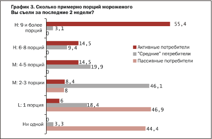 Таким образом, к активным потребителям относятся те, которые употребляют мороженое один и более раз в день, обычные потребители - это те, которые употребляют мороженое от 2-3 раз в неделю до 2-3 раз в месяц. Ну а пассивные потребители едят мороженое 1 и менее раз в месяц. По процентному распределению видно, что доля активных потребителей невелика - 10,8%, и наибольшие проценты приходятся на тех, кто относится к обычным, "средним" потребителям - 68%, пассив составляет 21,1%. Если же смотреть по объемам потребления, то видно, что больше всех потребляют именно активные, хотя "средние" также составляют значительную долю потребителей мороженого.