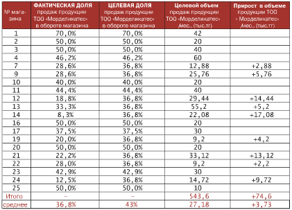 Разработка соответствующих стимулирующих программ и мероприятий поддержки позволит добиться увеличения доли продукции ТОО "Морделикатес"в обороте магазинов, в которых он значительно ниже - например, до уровня 36,8 %, а следовательно доля рынка ТОО "Морделикатес" соответственно увеличится на 5,5% и составит 38,2% (Таблица 2.).