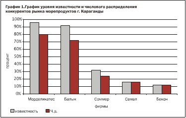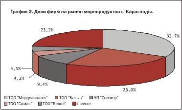 Таким образом, наибольшую долю на рынке морепродуктов г. Караганды занимает ТОО "Морделикатес" - 32,7%. Этому способствует достаточно интенсивный сбыт - 80% торговых точек - и взвешенное распределение - 88,9%.