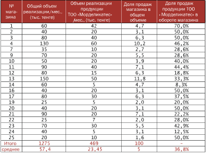 ак видно из таблицы высокую долю в обороте (более 57,4 тыс. тенге - среднего объема реализации за месяц) занимают магазины 1, 3, 4, 9, 11, 12, 13, 14, 17, 21, 23, итого 11 магазинов. При этом наименьшая доля продукции ТОО "Морделикатес" наблюдается в 14-ом магазине: всего 8,3% реализуемого им объема рыбной продукции. Как видно, в магазинах под номерами 1, 2, 3, 4, 10, 11, 16, 17, 20, 23, 25 доля продаж продукции ТОО "Морделикатес" выше среднего уровня, равного 36,8%, а в магазинах под номерами 7, 9, 12, 13, 14, 19, 21, 22, 24 - ниже.