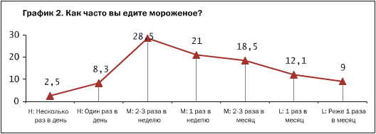Мы разделили наших любителей мороженого именно по частоте потребления. Для начала рассмотрим долю всех трех категорий потребителей (см. график № 2,3).