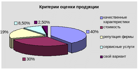 Следует отметить, что достаточно велик процент респондентов, указавших в качестве основного критерия репутацию фирмы. Это дает для фирмы огромный фронт работ по созданию имиджа фирмы, развитию сервисных услуг, завоевание «доброго имени», которое у всех на слуху и которому доверяют.