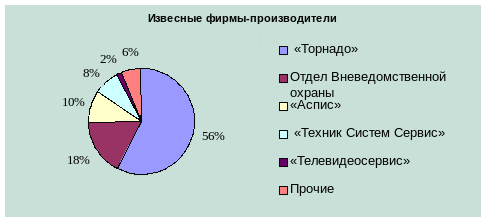 Среди названных фирм, указаны названия: «Техник Систем Сервис», «Аспис», Отдел Вневедомственной охраны, «Торнадо», «Телевидеосервис», «Нева», «Шериф», «Щит». Следует отметить, что на первых трех позициях оказались фирмы, активно использующие рекламу на телевидении, радио, других средствах массовой информации. Особенностью указанных фирм является также то, что они специализируются на системах охранной сигнализации, не уделяя внимания такой достаточно затребованной у населения части рынка систем безопасности, как видео и аудиодомофоны, видеоглазки и т.д.