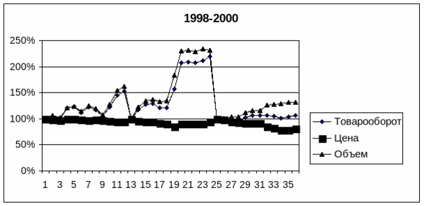 Трендовые зависимости объемов продаж, цен и товарооборотов за последние 3 года показывают, что рынок далек от насыщения и высокие темпы роста сохраняются, однако в 2000 году наблюдалось некоторое снижение темпов роста по сравнению с 1998 и 1999 годом.