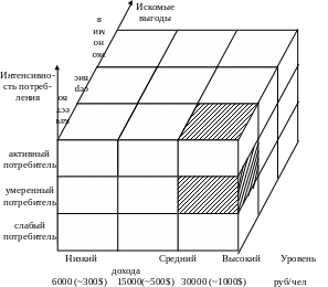 В результате совокупность потребителей представленная на рис. 2 оказывается поделенной на 27 (3х3х3) сегментов. Каждая семья принадлежит к одному из них. Сегмент рынка, принятый к обслуживанию, па графике выделяется штриховкой.