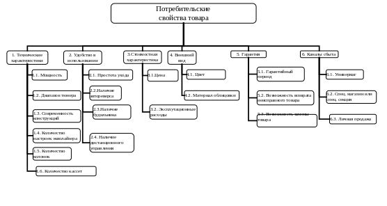 На первом уровне "дерева целей" указываются свойства товара, а в качестве элементарных "целей" выступают отдельные характеристики товара. Пример построения "дерева целей" приведен на рис. 1.