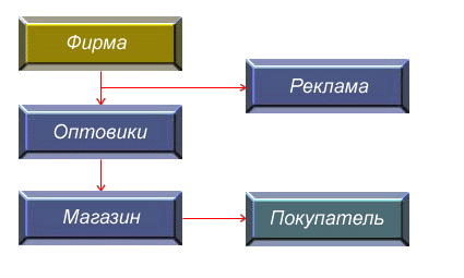 Как видно из рисунка фирме приходится тратить деньги на рекламу. После чего товар с завышенной ценой попадает в цепь оптовиков, которые, в свою очередь, также поднимают цену. Ну а потом товар идет через магазин и еще более накрученный попадает к покупателю. Общая накрутка по статистике составляет 300-500%.