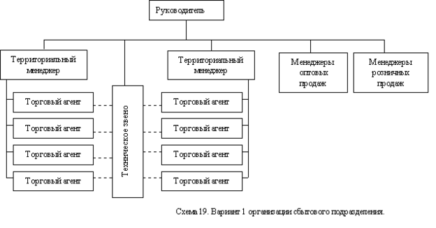 отечественной практике можно выделить два типа функциональных построений, относительно успешных на настоящий момент. Схема 19 иллюстрирует структуру "жесткой" организации сбытового подразделения.