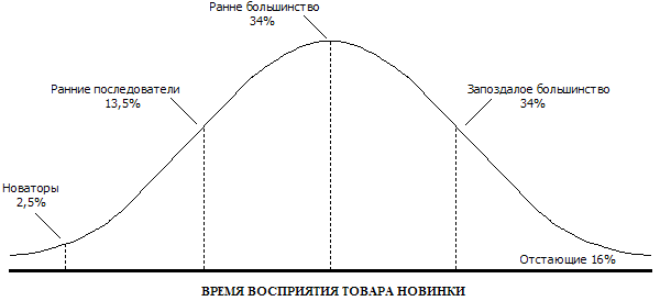 Другие люди воспринимают новинки гораздо позже. Все это позволило классифицировать людей по степени их восприимчивости (см. рис. 9). После замедленного начала новинку начинает воспринимать все больше людей. Со временем их число достигает пикового значения, а затем процент начинает уменьшаться по мере уменьшения числа еще не воспринявших товар. Новаторами считают первые 2,5% покупателей, к ранним последователям относят следующие 13,5% и т.д.