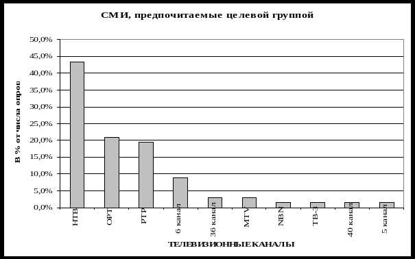 Наиболее предпочитаемые телевизионные каналы: НТВ - 43,3% , РТР - 19,4% .