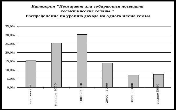 б) Распределение по среднемесячному доходу на 1 члена семьи всех посещающих или желающих посещать косметические салоны