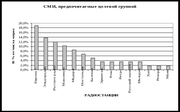 Наиболее предпочитаемые радиостанции: «Европа+» - 19% , «Эльдорадио» - 13,8% , «Русское радио» - 12,1% , «Максимум» - 10,3% ;