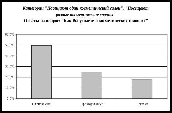 Женщины, которые посещают косметический салон, демонстрируют высокую приверженность выбранному ими салону: 82 % женщин, посещающих салоны, пользуются услугами только одного салона. Таким образом, основной задачей является «закрепление» клиента за салоном, высокая текучка клиентов является результатом недостаточной привлекательности данного салона для клиента.