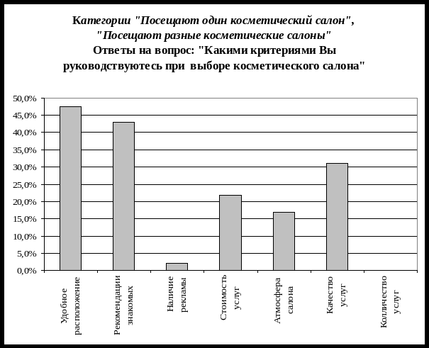 Основными критериями выбора конкретного косметического салона являются: его месторасположение, рекомендации знакомых, которые являются гарантией получения услуг высокого качества и непосредственно само качество услуг.