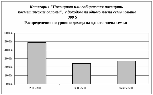 ) Распределение представительниц целевой группы по среднемесячному доходу на 1 члена семьи от 300 $. и выше (уже посещающие или желающие посещать салон красоты)