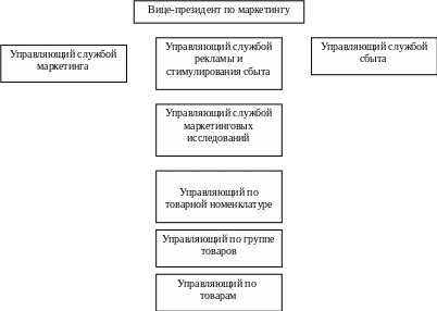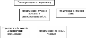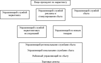 При создании отделов маркетинга чаще всего встречается вариант функциональной организации, при которой ответственность за выполнение каждой отдельной маркетинговой функции несет собственный управляющий, подчиняющийся вице-президенту по маркетингу. Организация по географическому принципу позволяет торговым агентам сконцентрировать свои усилия на конкретном географическом рынке. Еще один вариант-организация по товарному производству, при которой производством каждого отдельного товара руководит собственный управляющий, сотрудничающий со специалистами остальных функциональных служб. Следующий вариант-организация по рыночному принципу, при которой основные рынки закрепляют за управляющими по рынкам. Ряд крупных фирм используют организацию по товарно-рыночному принципу.