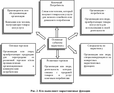 убъекты маркетинга включают производителей и организации обслуживания, оптовые и розничные торговые организации, специалистов по маркетингу и различных потребителей. Как показано на рисунке 2, у каждого из них своя роль. Важно отметить, что хотя ответственность за выполнение маркетинговых функций может делегироваться и распределяться различными способами, совсем ими в большинстве случаев пренебречь нельзя, они должны обязательно кем-то выполняться.
