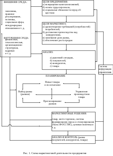 Маркетинг (от английского market - рынок) - комплексная система организации производства и сбыта продукции, ориентированная на удовлетворение потребностей конкретных потребителей и получение прибыли на основе исследование и прогнозирования рынка, изучения внутренней и внешней среды предприятия-экспортера, разработки стратегии и тактики поведения на рынке с помощью маркетинговых программ. В этих программах заложены мероприятия по улучшению товара и его ассортимента, изучению покупателей, конкурентов и конкуренции, по обеспечению ценовой политики, формированию спроса, стимулированию сбыта и рекламе, оптимизации каналов товародвижения и организации сбыта, организации технического сервиса и расширения ассортимента представляемых сервисных услуг. Маркетинг как порождение рыночной экономики является в определенном смысле философией производства, полностью (от научно-исследовательских и проектно-конструкторских работ до сбыта и сервиса) подчиненной условиям и требованиям рынка, находящимся в постоянном динамическом развитии под воздействием широкого спектра экономических, политических, научно-технических и социальных факторов. Предприятия-производители и экспортеры рассматривают маркетинг как средство для достижения целей, фиксированных на данный период по каждому конкретному рынку и его сегментам, с наивысшей экономической эффективностью. Однако это становится реальным тогда, когда производитель располагает возможностью систематически корректировать свои научно-технические, производственные и сбытовые планы в соответствии с изменениями рыночной конъюнктуры, маневрировать собственными материальными и интеллектуальными ресурсами, чтобы обеспечить необходимую гибкость в решении стратегических и тактических задач, исходя из результатов маркетинговых исследований. При этих условиях маркетинг становится фундаментом для долгосрочного и оперативного планирования производственно-коммерческой деятельности предприятия, составления экспортных программ производства, организации научно-технической, технологической, инвестиционной и производственно-сбытовой работы коллектива предприятия, а управление маркетингом - важнейшим элементом системы управления предприятием.
