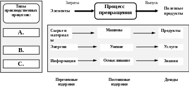 Производственная (операционная) система есть целенаправленный процесс, благодаря которому происходит превращение отдельных элементов в полезную продукцию. Иными словами, она представляет собой определенную технологию, в соответствии с которой завершается трансформация затрат в продукцию , см. рис 1.